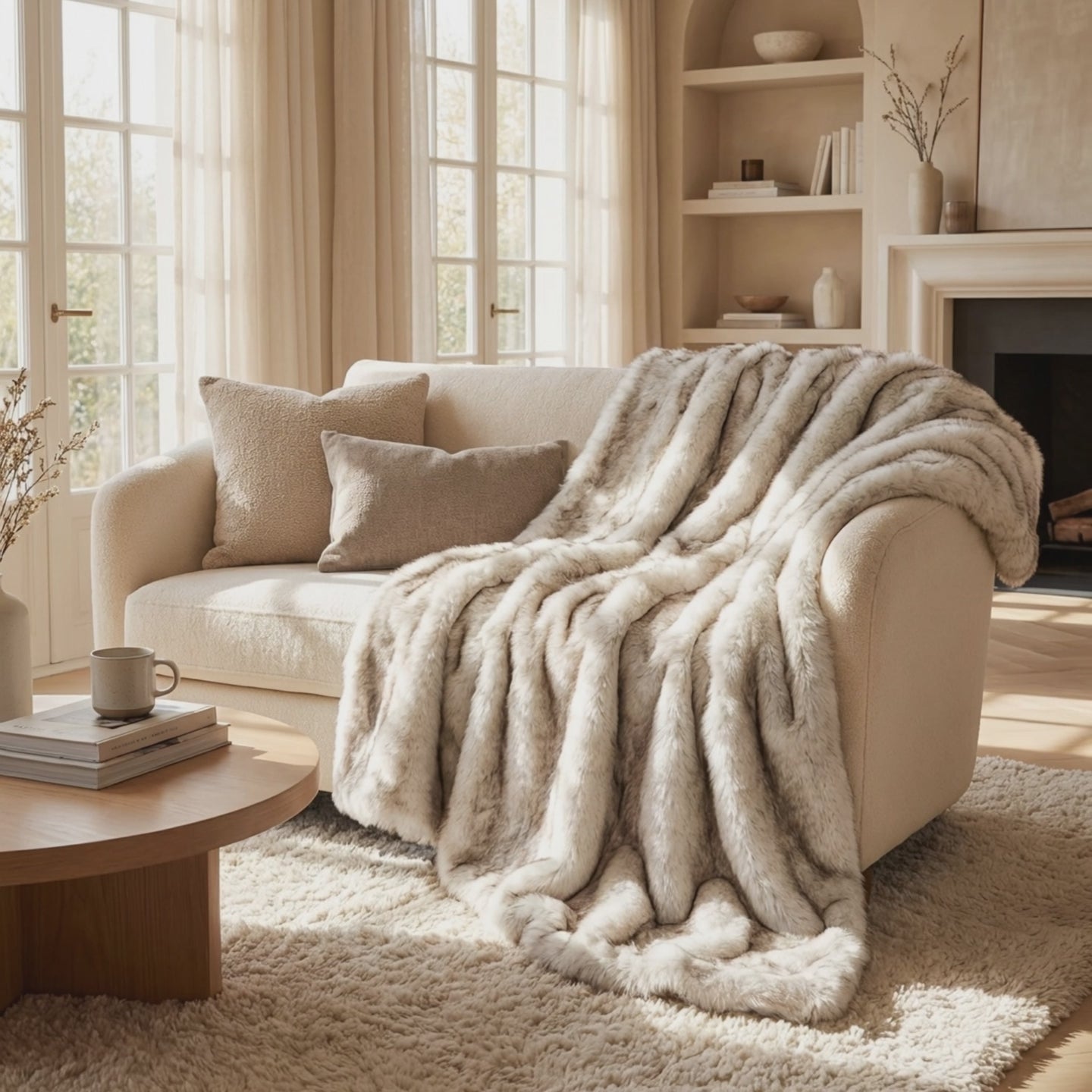 The Champagne Cloud™ is the throw that changes a room the second it lands. Thick, heavy, and ultra plush, it delivers the kind of visual impact you normally see styled across designer homes and architectural interiors. The faux fur is dense and dimensional, catching light beautifully while maintaining a rich, substantial drape that never looks flat or flimsy. In timeless ivory, it blends effortlessly into modern neutrals, layered textures, and statement spaces alike.